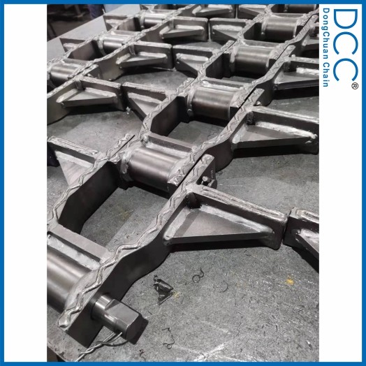 熱處理后達(dá)到很高的抗拉強(qiáng)度和耐磨性,套筒,銷軸采用表面高頻的工藝,提高了表面的硬度,使鏈條具有超高的耐磨性。鏈條的鏈板和刮板兩側(cè)采用高耐磨焊絲堆焊的工藝,用國(guó)內(nèi)先進(jìn)的高耐磨焊絲,通過焊接機(jī)器人自動(dòng)焊接,使得焊縫均勻的堆焊在鏈板兩側(cè),同時(shí),在鏈條其它容易磨損的地方也都采用了耐磨焊絲堆焊的工藝,使整個(gè)鏈條都具備超高的耐磨性,耐磨焊絲焊接后表面硬度可以達(dá)到HRC50-60,能長(zhǎng)時(shí)間使用鏈條不磨損。