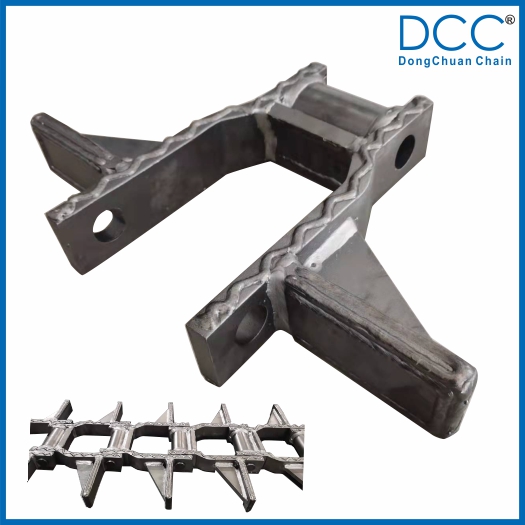 鏈條的刮板與鏈板焊接后又增加了一塊加強(qiáng)板,大大提高了刮板與鏈板的焊接強(qiáng)度,在鏈條的使用過程中,能使刮板長(zhǎng)期承受較高的沖擊載荷而不脫焊。
