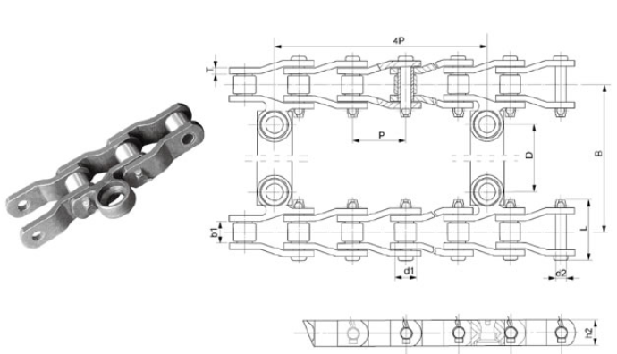 | 鏈號 | 節距 P (mm) | 滾子直徑 d1 (max) (mm) | 內寬內度 b1 (min) (mm) | 銷軸直徑 d2 (max) (mm) | 銷軸長度 L (max) (mm) | 鏈板高度 h2 (max) (mm) | 鏈板 厚度 T (mm) | 抗拉強度 Q (min) (KN) | |||