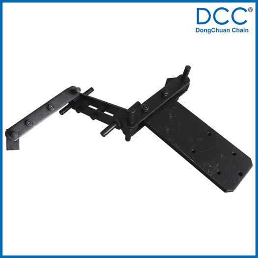 雙鉸接鏈條由一節十字節和鏈條相連,鏈條能360°內任意轉動,可以使用十字軌道和圓形軌道,鏈輪的橫縱面都有專用的軸承支撐,使鏈條運行時更平穩,在鏈條的底部裝有吊具板,可以根據不同的使用要求設計。鏈條的零件為中碳鋼,經熱處理后使用,對部分有腐蝕的環境,在鏈條的表面進行了發黑處理。
