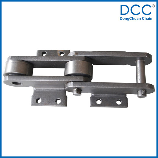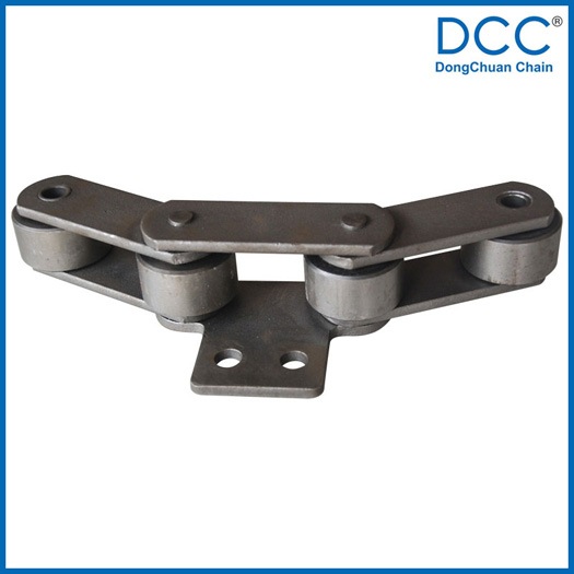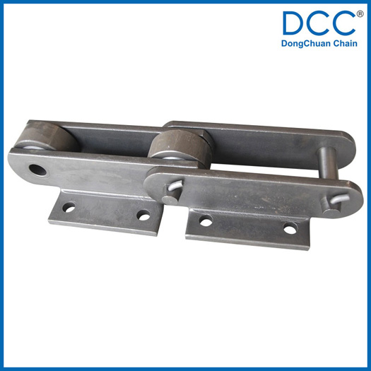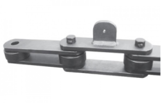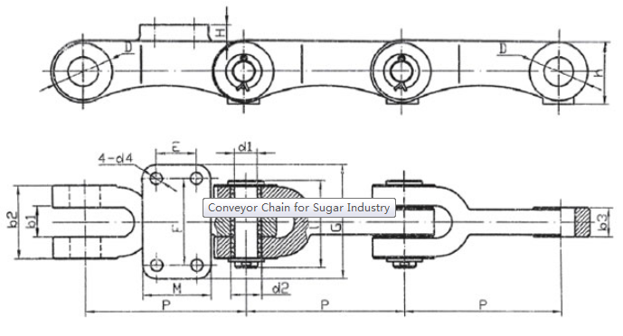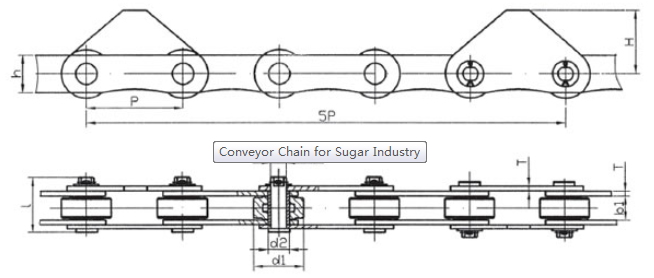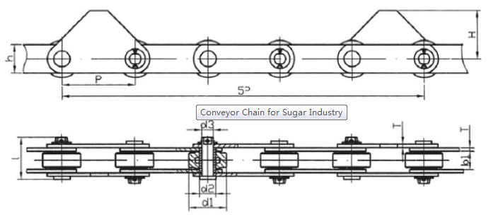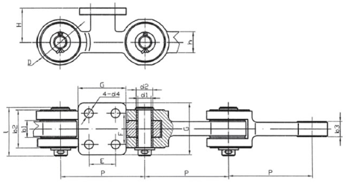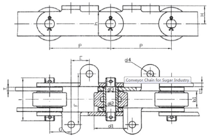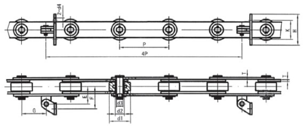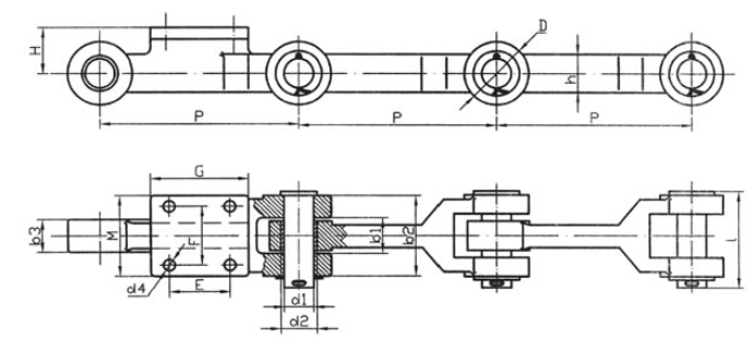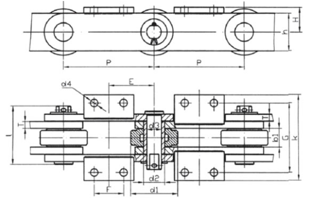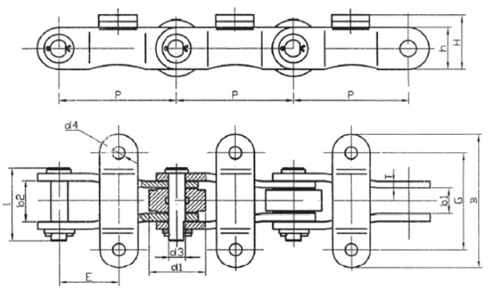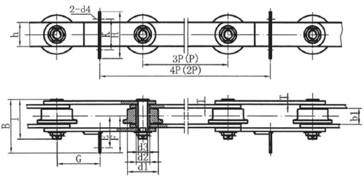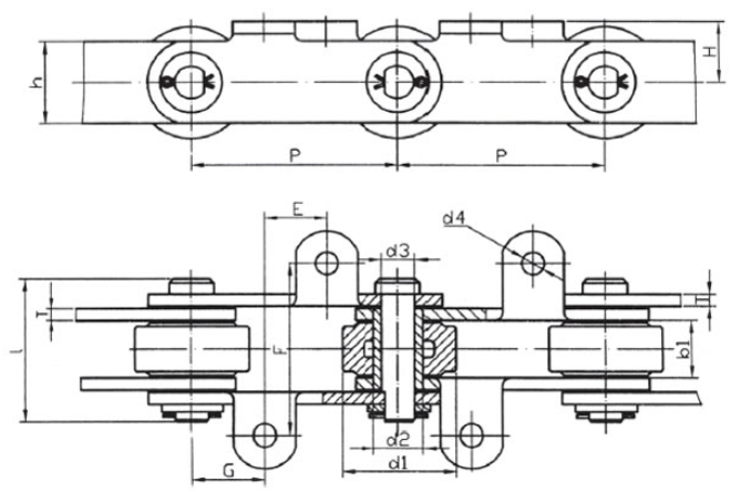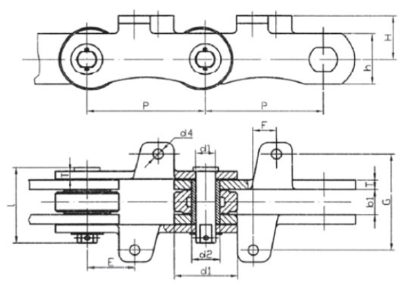 | Chain no. | Pitch P (mm) | Inner width of inner link b1 (min.) (mm) | Diameter of pin d3 (mm) | Diameter of roller d1 (min.) (mm) | Height of sidebar h (mm) | Thickness of sidebar T (mm) | Length of pin L (mm) | Central distance of attached plate f(mm) | Hole distance of attached plate L1(mm) | Hole diameter of attached plate d4(mm) | Spanning width of attached plate L2(mm) | Height of attached plate h4(mm) | Tensile strength (KN) |