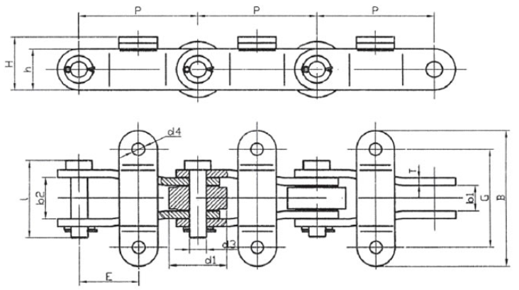 | Chain no. | Pitch P (mm) | Inner width of inner link b1 (min.) (mm) | Diameter of pin d3 (mm) | Diameter of roller d1 (min.) (mm) | Height of outer sidebar h1 (mm) | Height of inner sidebar h2 (mm) | Thickness of sidebar T (mm) | Length of pin L (mm) | Hole distance of attached plate f (mm) | Hole diameter of attached plate d4(mm) | Tensile strength (KN) |