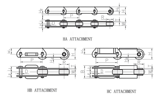 | Chain No. | Roller type | Pitch P (mm) | Inner width of inner link W (mm) | Diameter of roller R (max) (mm) | Height of chain H (mm) | Data of sidebar | Data of pin | Tensile strength Q (KN) | |||||