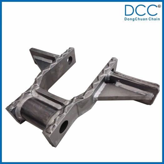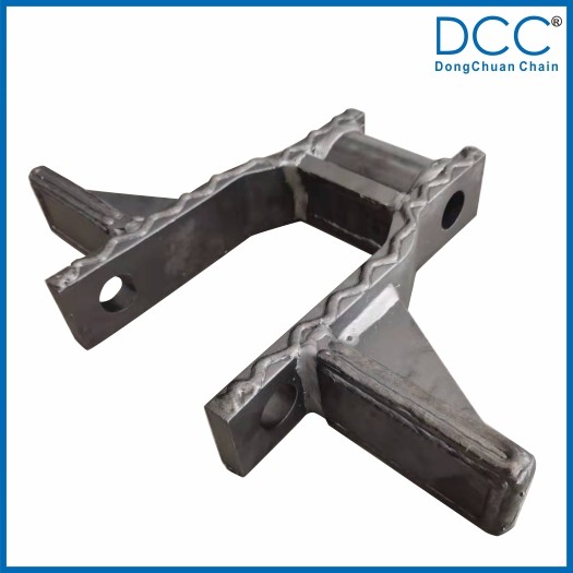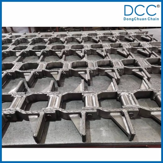 鏈條的刮板與鏈板焊接后又增加了一塊加強(qiáng)板,大大提高了刮板與鏈板的焊接強(qiáng)度,在鏈條的使用過程中,能使刮板長(zhǎng)期承受較高的沖擊載荷而不脫焊。
