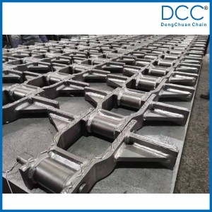 熱處理后達(dá)到很高的抗拉強(qiáng)度和耐磨性,套筒,銷軸采用表面高頻的工藝,提高了表面的硬度,使鏈條具有超高的耐磨性。鏈條的鏈板和刮板兩側(cè)采用高耐磨焊絲堆焊的工藝,用國(guó)內(nèi)先進(jìn)的高耐磨焊絲,通過焊接機(jī)器人自動(dòng)焊接,使得焊縫均勻的堆焊在鏈板兩側(cè),同時(shí),在鏈條其它容易磨損的地方也都采用了耐磨焊絲堆焊的工藝,使整個(gè)鏈條都具備超高的耐磨性,耐磨焊絲焊接后表面硬度可以達(dá)到HRC50-60,能長(zhǎng)時(shí)間使用鏈條不磨損。