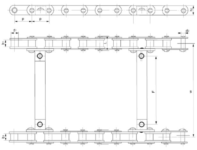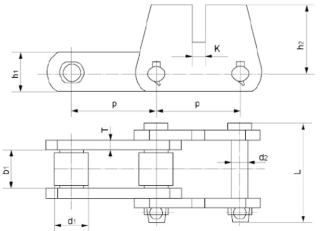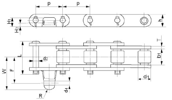 節距 P (mm) | 內節內寬 b1 (mm) | 滾子直徑 d1 (min.) (mm) | 銷軸直徑 d (mm) | 銷軸 長度 L (mm) | 鏈板高度 h1 (max) (mm) | 鏈板厚度 T (max) (mm) | 附件尺寸 | 抗拉強度Q (min) (KN) | |