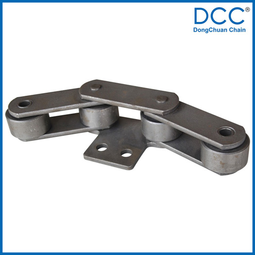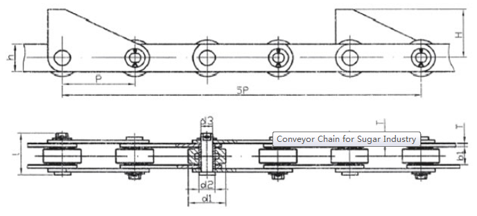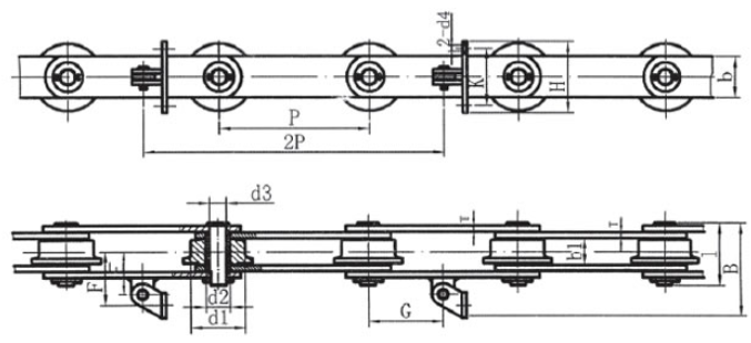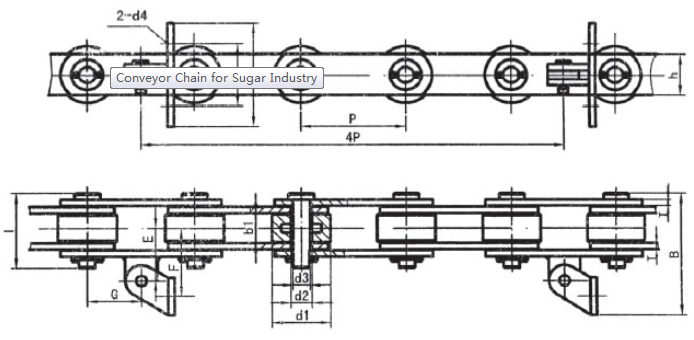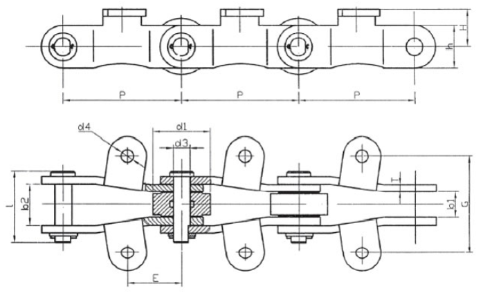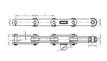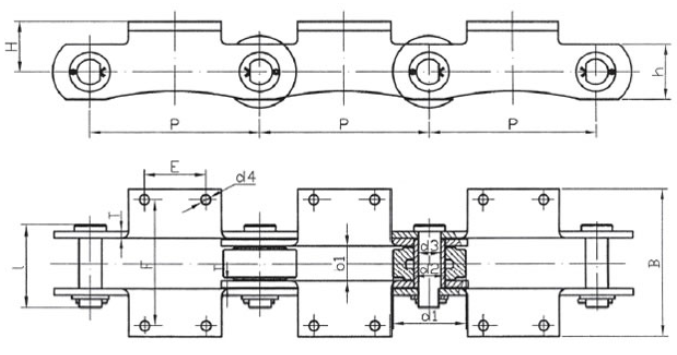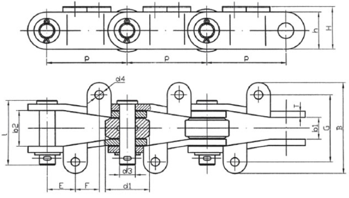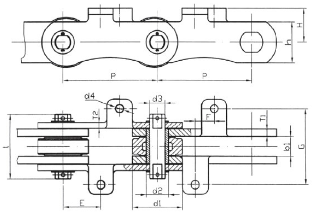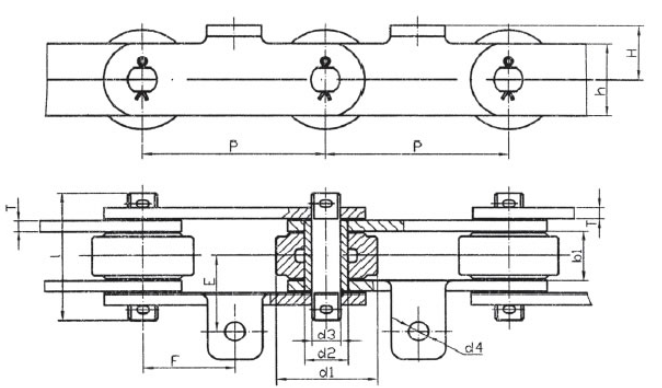 | Chain no. | Pitch P (mm) | Inner width of inner link b1 (min.) (mm) | Diameter of pin d3 (mm) | Diameter of roller d1 (min.) (mm) | Height of sidebar h (mm) | Thickness of sidebar T (mm) | Length of pin L (mm) | Central distance of attached plate f(mm) | Hole distance of attached plate L1(mm) | Hole diameter of attached plate d4(mm) | Spanning width of attached plate L2(mm) | Height of attached plate h4(mm) | Tensile strength (KN) |