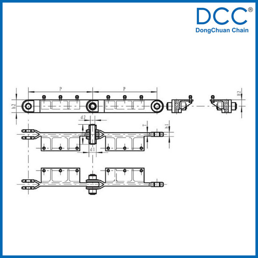 | Chain No. | Pitch P (mm) | Inner width of inner link b1 (mm) | Diameter of roller d1 (mm) | Diameter of pin d2 (mm) | Height of sidebar h2 (mm) | Thickness of sidebar T (mm) | Height of platform H2 (mm) | Tensile strength Q (KN) |